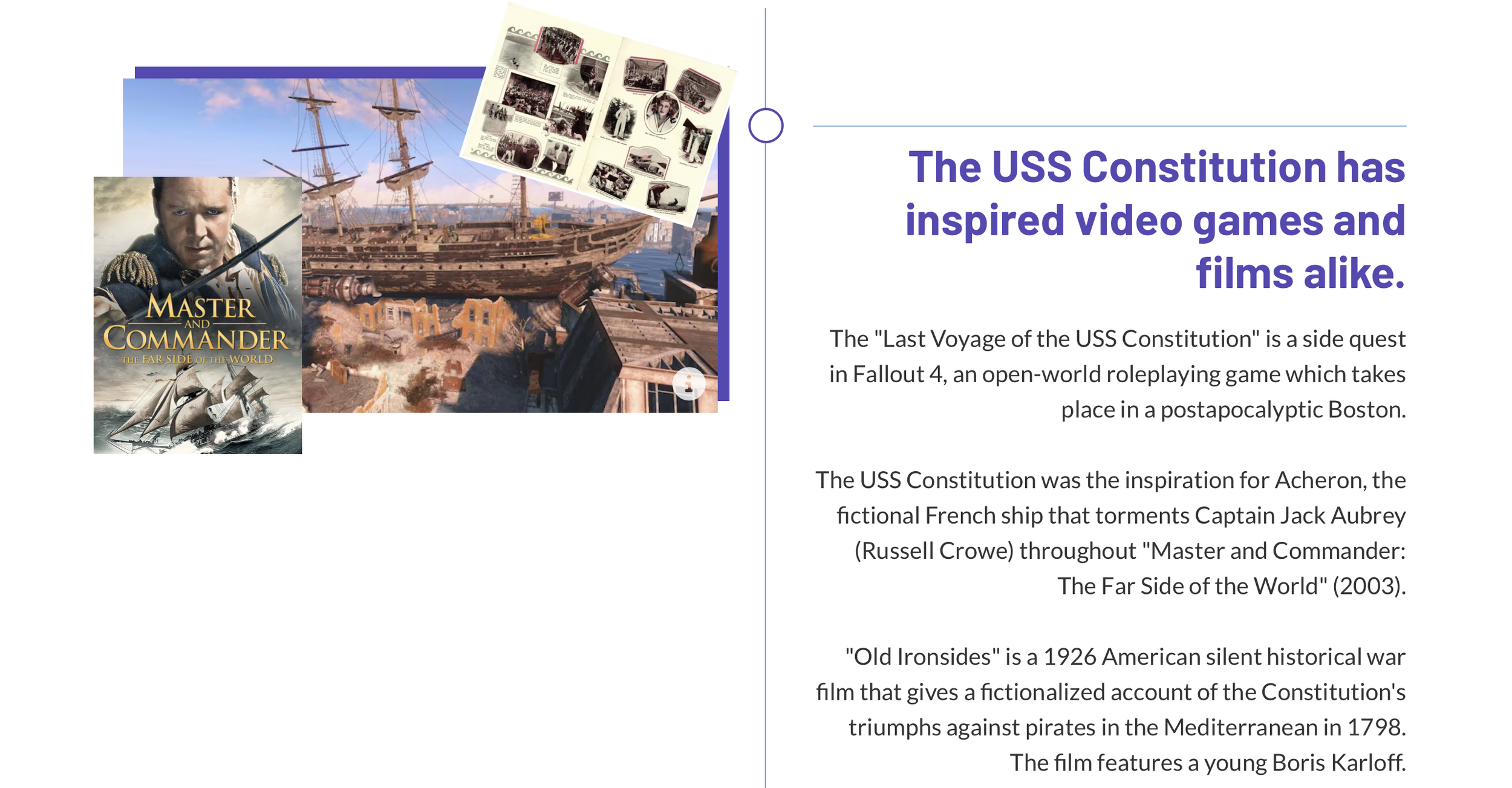 This immersive multimedia experience invites you to step into the boots of a sailor aboard America’s most famous warship. It features historical fiction, trivia, fun facts, a quiz, videos, photo galleries and more. See More Each highlighted term opens a text box with more information. Each photo was carefully selected and uploaded with all metadata. Fallout fans will be delighted to learn about the historical origins of a popular side quest.