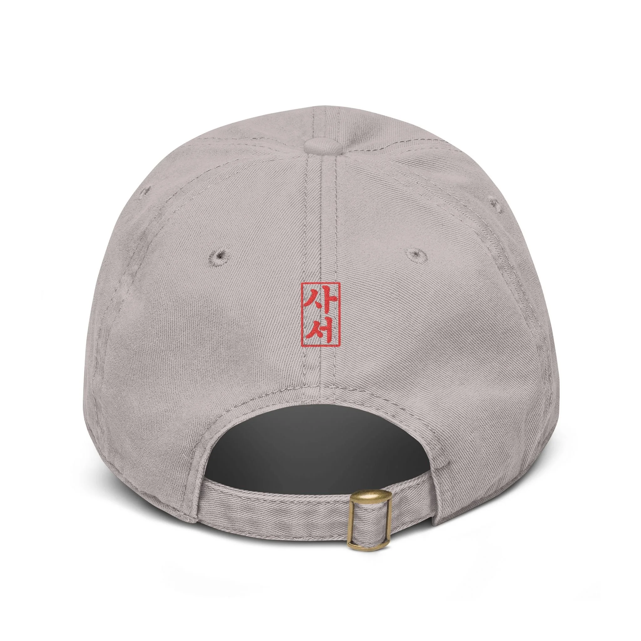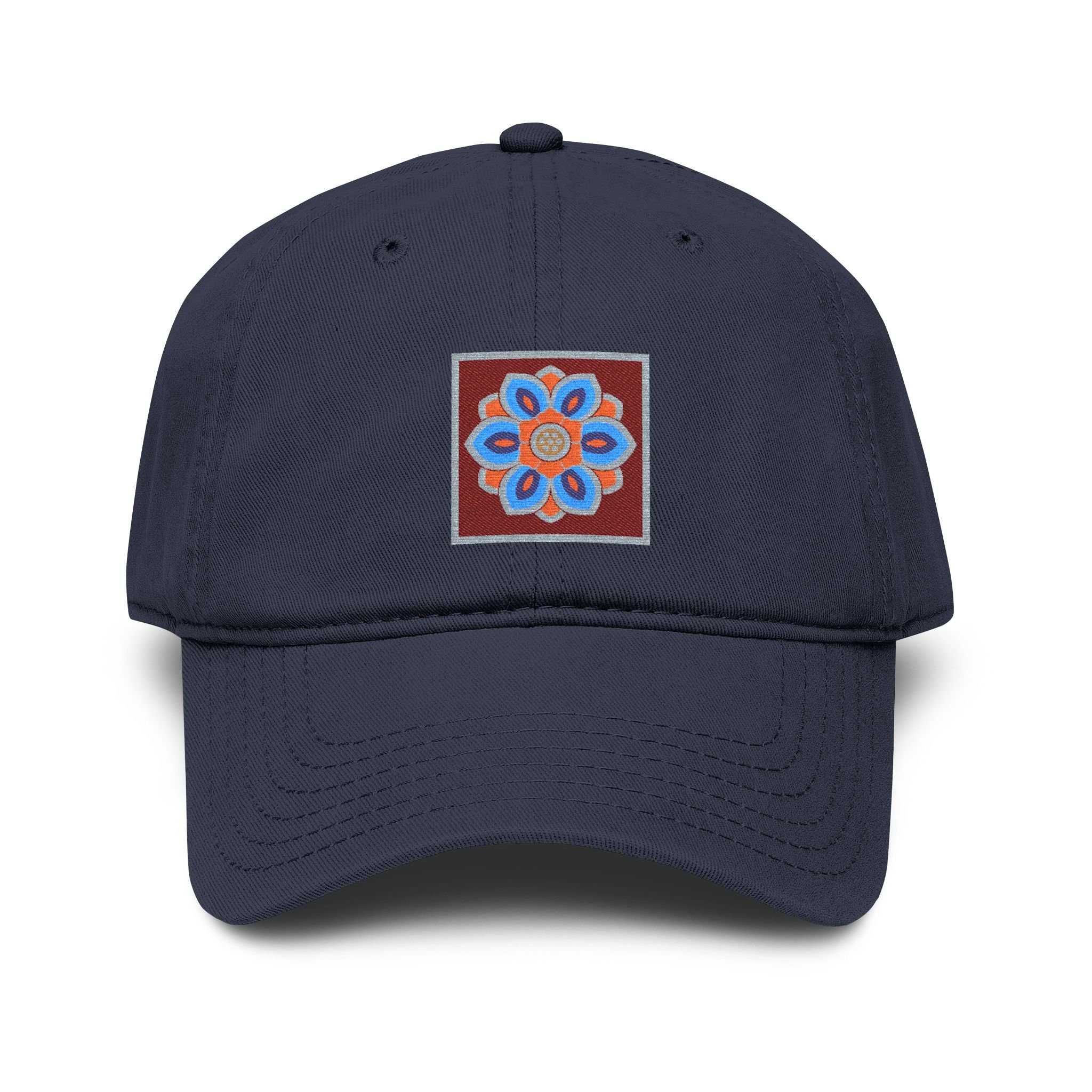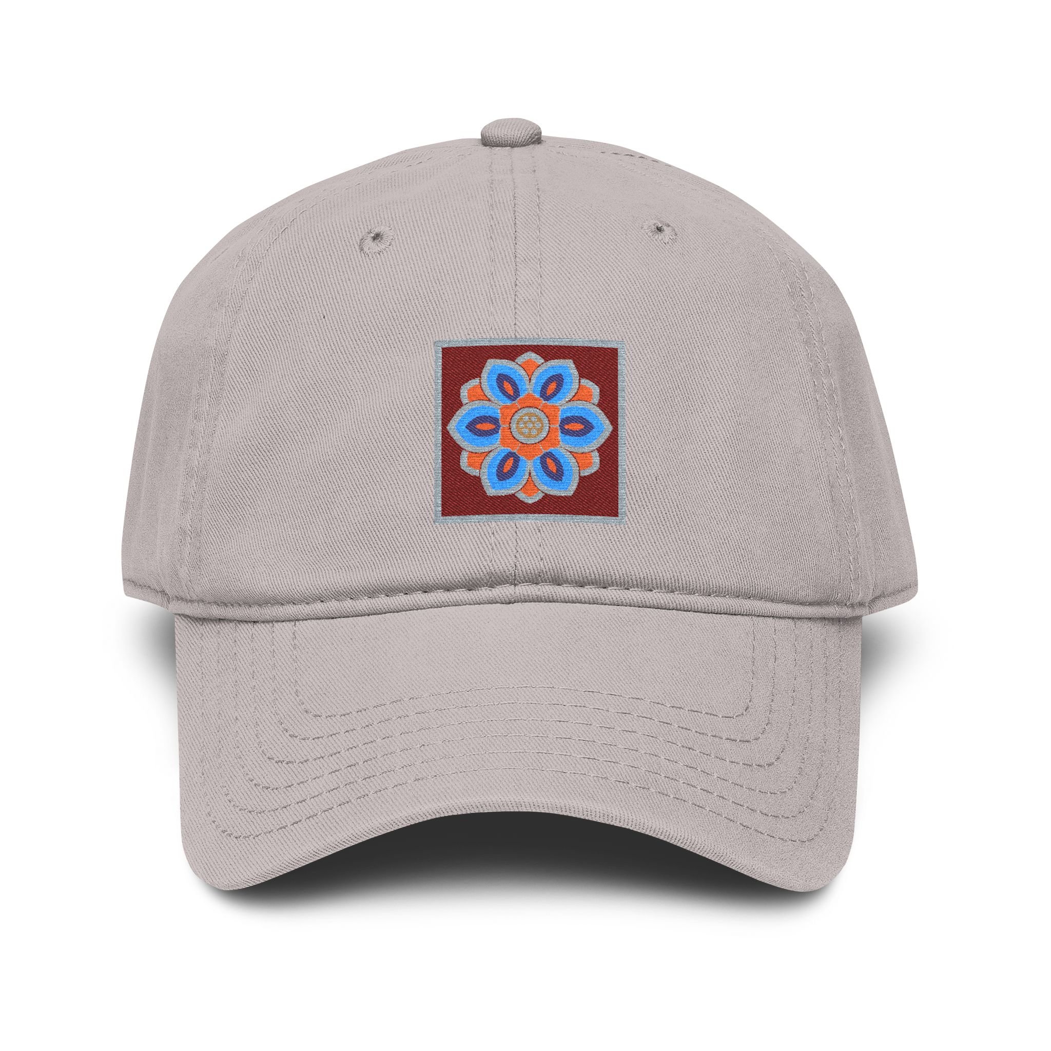 A washed baseball cap with a relaxed, low-profile fit and a small embroidered lotus tile at the front. The design is inspired by dancheong ( 단청), the traditional painted patterns found on Korean temple architecture.