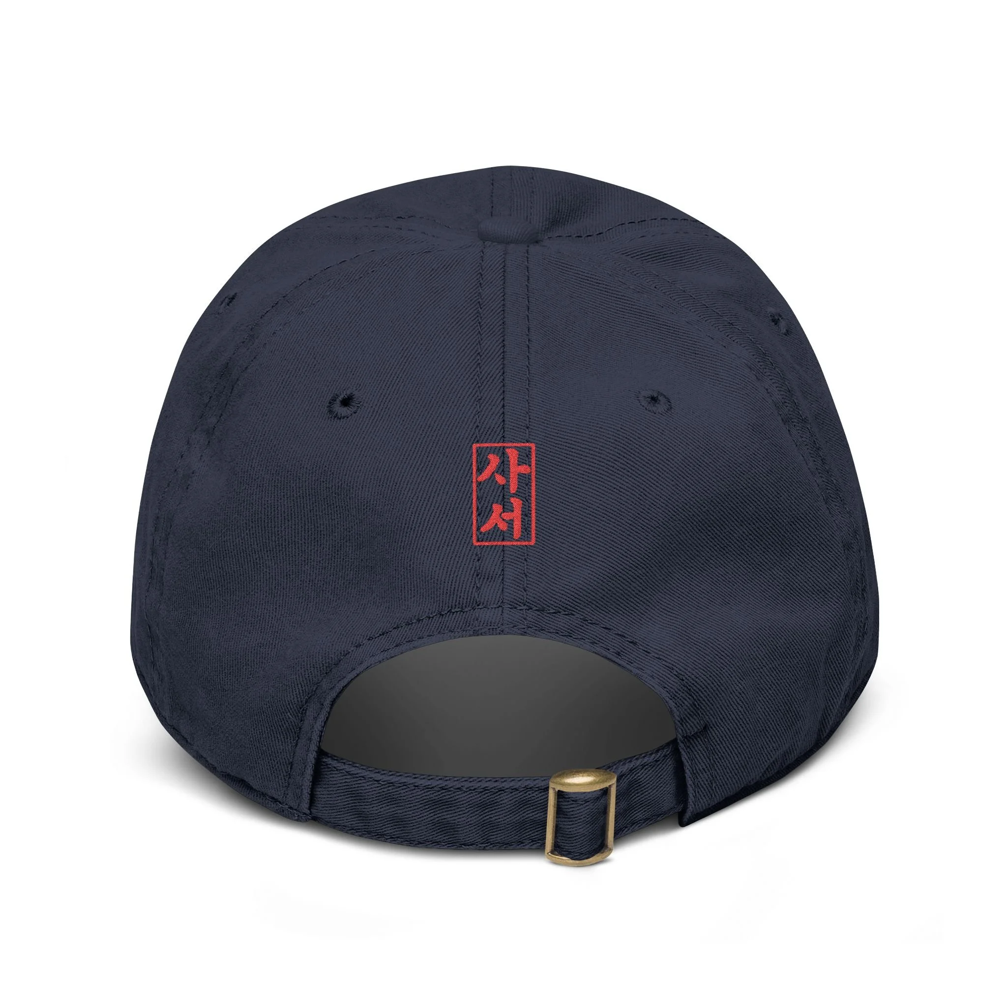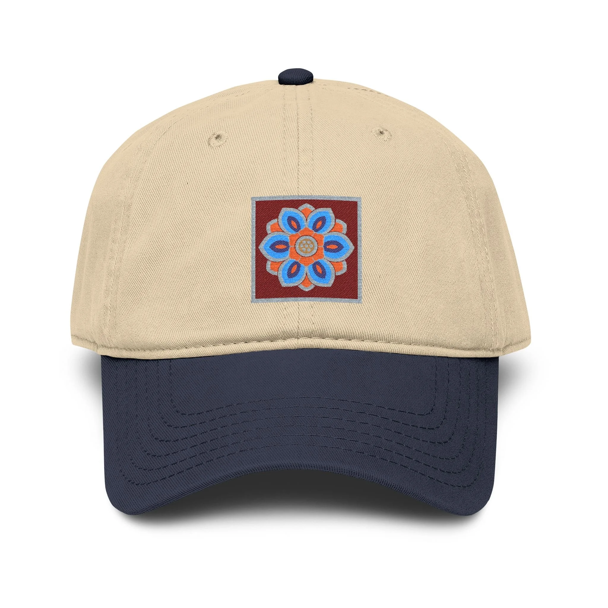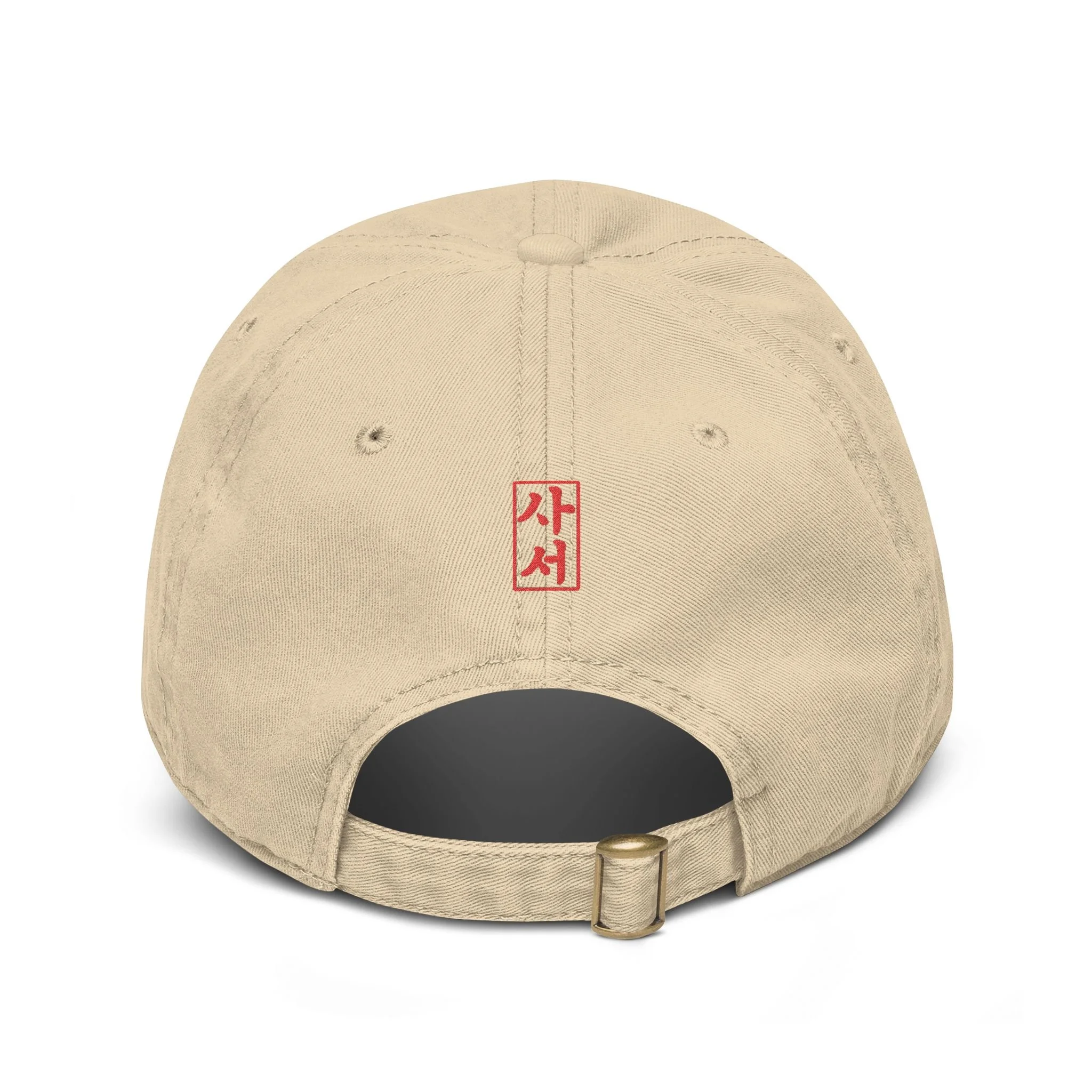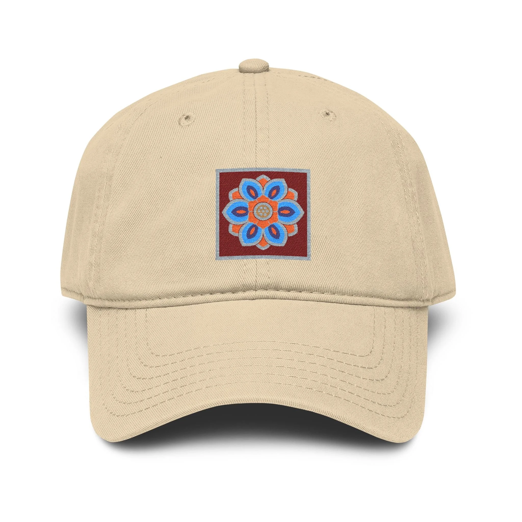 A washed baseball cap with a relaxed, low-profile fit and a small embroidered lotus tile at the front. The design is inspired by dancheong ( 단청), the traditional painted patterns found on Korean temple architecture.
