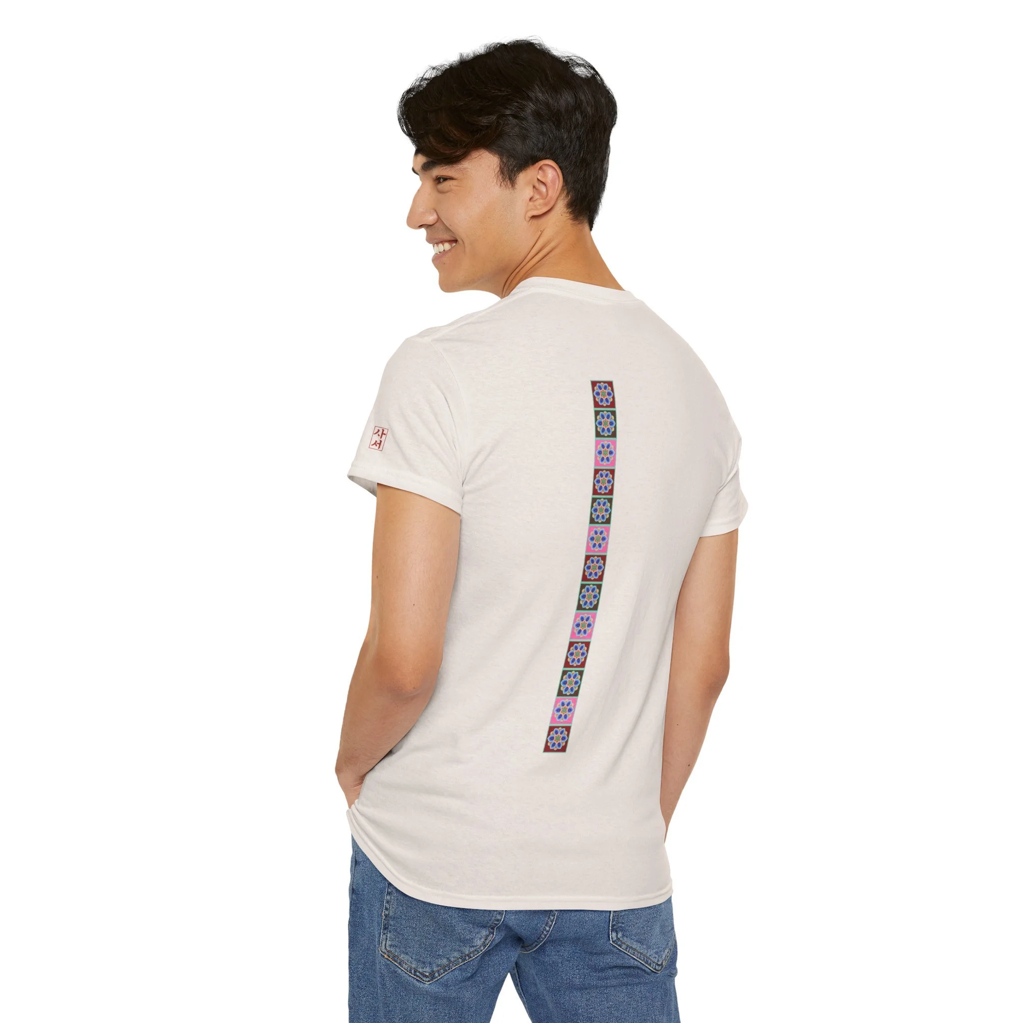 A bridge between Seoul streetwear and Korean heritage. This 100% cotton tee has 기록하다 (girok-hada), meaning “to record," across the chest and a lotus flower tile underneath. On the back, more tile motifs from Sudeoksa Temple trace your spine. Our Saseo.Studio logo rests on the left sleeve.
